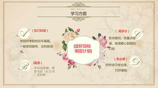 蒋国亚同学在校期间曾获国家奖学金、一等学业奖学金等,现就读于华中师范大学。他详细的介绍了自己的考研复习规划和时间表,建议同学结合自己的学习习惯合理的规划学习时间,勉励同学们一定要付诸行动,坚持不懈。