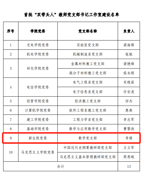 日前,校党委公布学校首批“双带头人”教师党支部书记工作室建设名单。经各学院党委推荐,组织部初审、专家评议、校党委审定,遴选产生学校首批13个“双带头人”教师党支部书记工作室,我院数学党支部(建设负责人为支部书记李倩)进入名单。