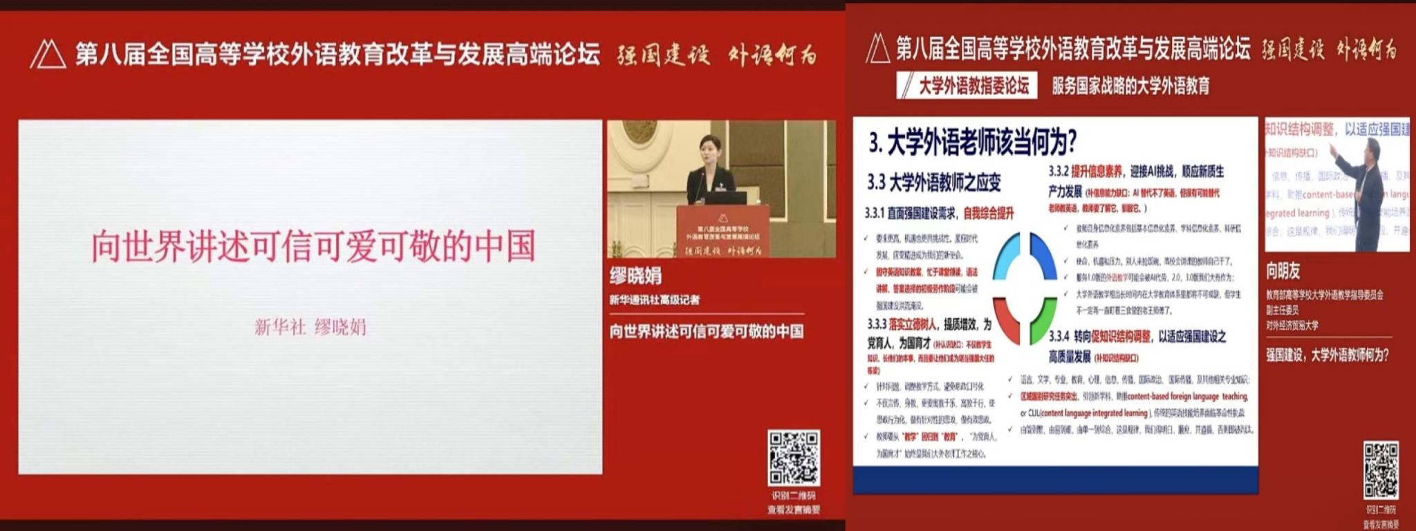 论坛期间,教师们还参与了多个专题论坛的讨论,聆听来自全国各地的外语同仁交流心得、互促共进。大会邀请了毕业于上海外国语大学的缪女士做了《向世界讲述可信可爱可敬的中国》的主旨发言,为新时代外语教育中课堂思政建设指明目标。通过听取其他兄弟院校的大学英语改革经验分享、推进AI赋能大外教学经历探讨,不仅拓宽了视野,还学习了许多新的教学理念和教学方法。