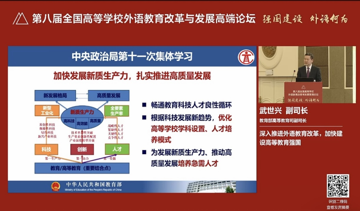 组织公共外语系全体教师通过线下+线上方式参与全国外语届教育盛会“第八届”。此次论坛主题为“强国建设 外语何为”,旨在深入探讨外语教育在强国建设中的角色与担当,为外语教育的高质量发展指明方向。