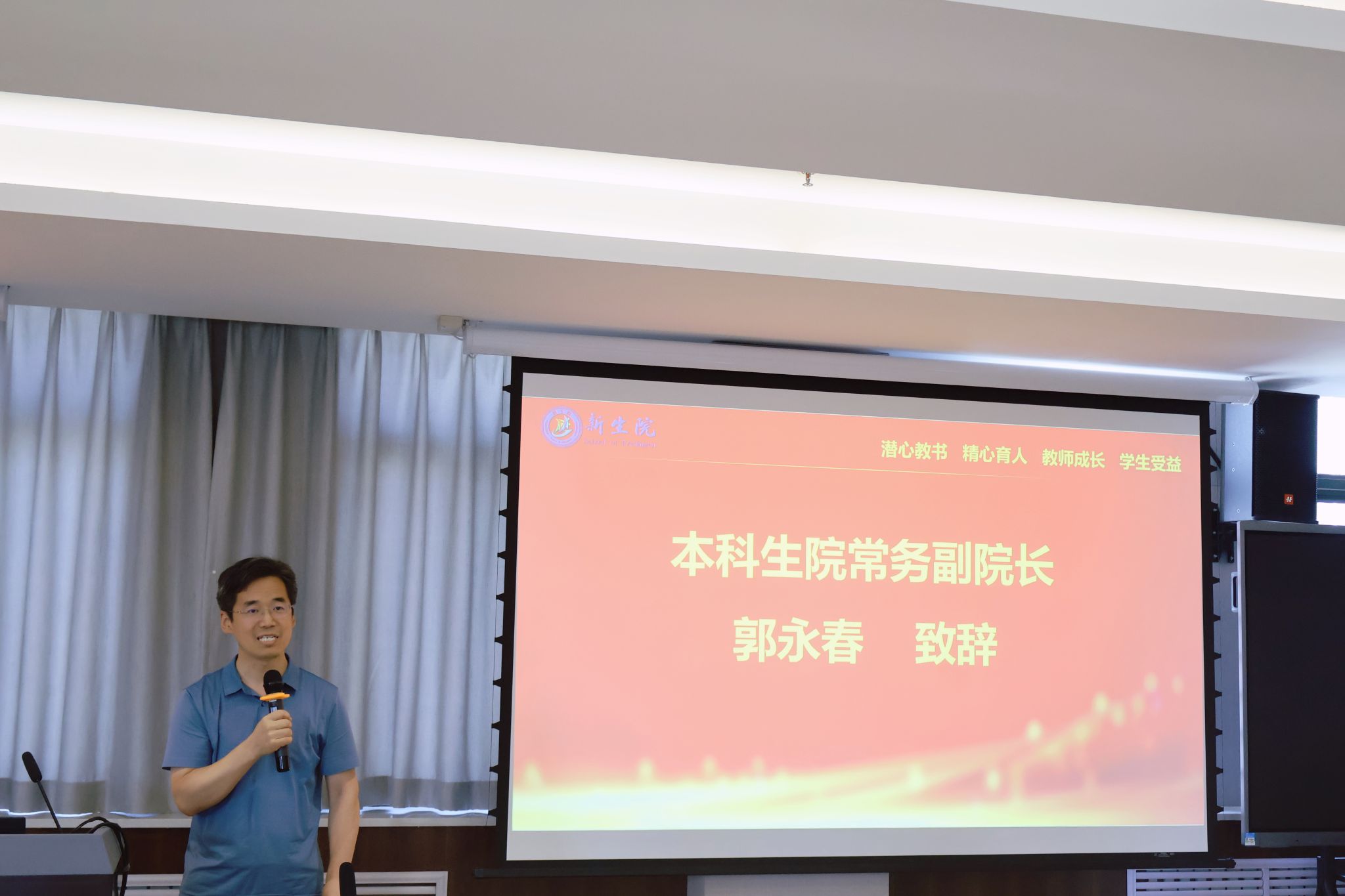 最后,本科生院常务副院长郭永春做总结发言,对学院成立以来所取得的诸多成果给予肯定,并对教师们提出三点建议:一要坚持心有大我,以课程思政改革落实立德树人任务。二要坚持守正创新,以数智赋能教育教学模式创新。三要坚持勤学笃行,以审核评估提升人才培养质量。