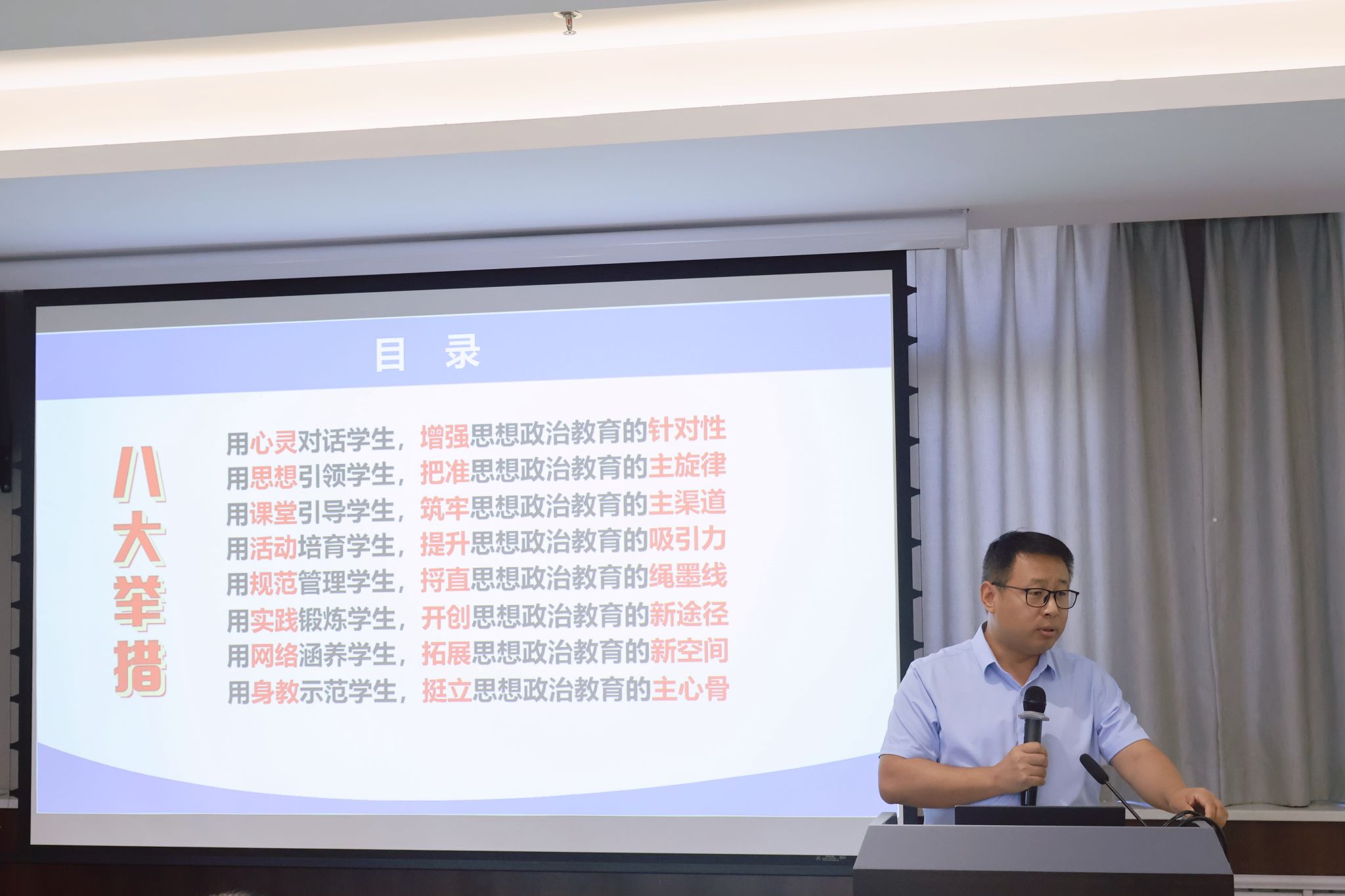 校党委学生工作部副部长张晓宾作了题为《实施八大举措、推进立德树人——打造有温度有力度有高度的大学生思想政治教育工作》的报告。结合实际案例向教师们阐述当代大学生的群体特点,讲解了高校思想政治工作遵循,围绕八大举措切实的说明高校思想政治工作就是要以学生为中心,围绕、关照、服务学生。