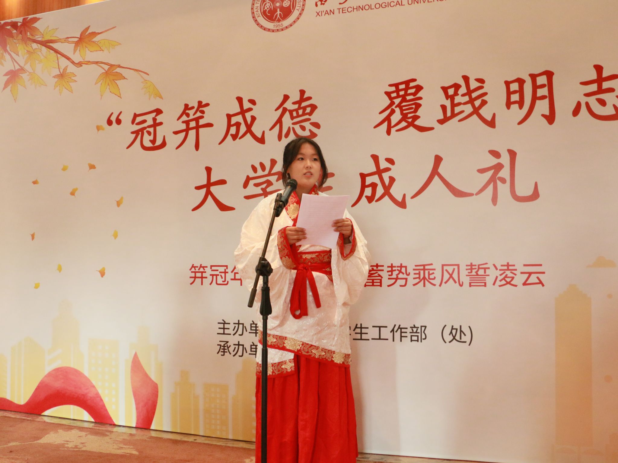 人工智能专业贾燕泽代表学子发言,承诺铭记成人礼誓言,牢记时代赋予大学生的光荣使命,用实际行动践行自己的理想和信念。