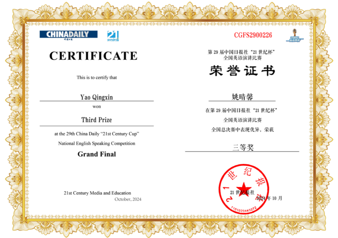 10月17日至10月21日,由中国日报社、21世纪英语教育传媒承办的第29届中国日报社“21世纪杯”全国大学生英语演讲比赛全国赛在无锡落下帷幕。壹号娱乐2023级姚晴馨同学获得全国三等奖,实现壹号娱乐在该竞赛获奖级别的历史性突破。