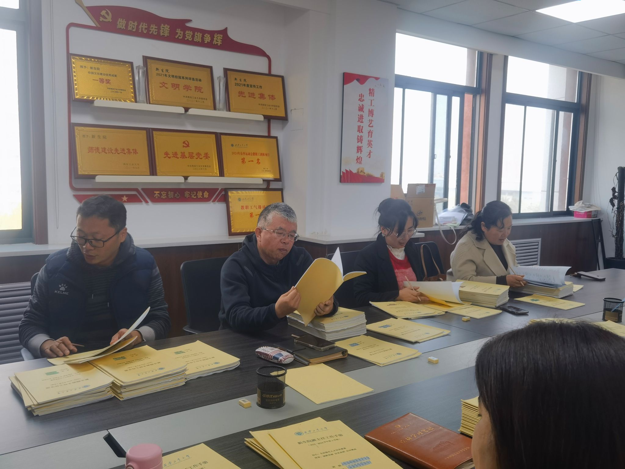 考核工作由班主任大组长、小组长组成的评审小组负责。学生工作办公室主任王娟向评议小组详细讲解了班主任管理办法及工作手册的考核内容、评分标准和评价等级。班主任大、小组长秉持“公平、公正、公开”的原则,从工作计划与总结、学生基本情况记录、班级活动记录、学生谈话记录、班级获奖情况等多个方面对班主任工作手册进行了认真细致的检查,按照五个等级进行盲评。