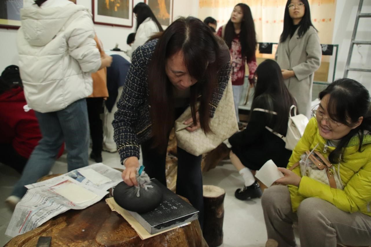 随后教师们还动手体验了拓片的制作过程。大家小心翼翼地铺上宣纸,用刷子将纸刷展,再用拓包蘸上墨水轻轻拍打。不一会儿,一张张黑底白字的拓片便呈现出来。