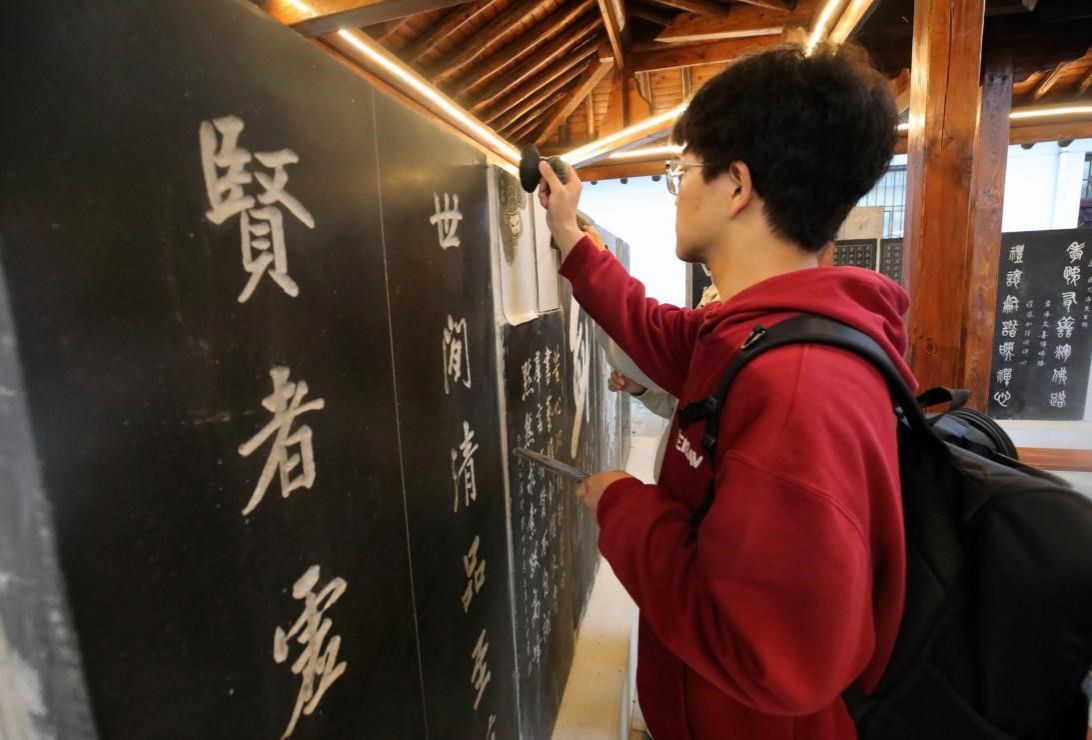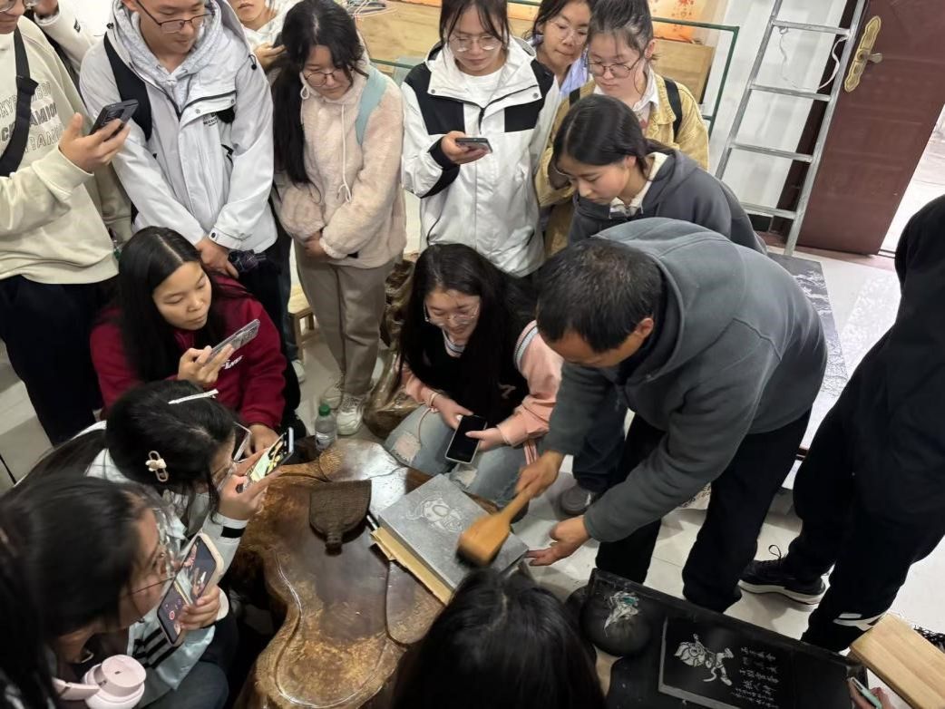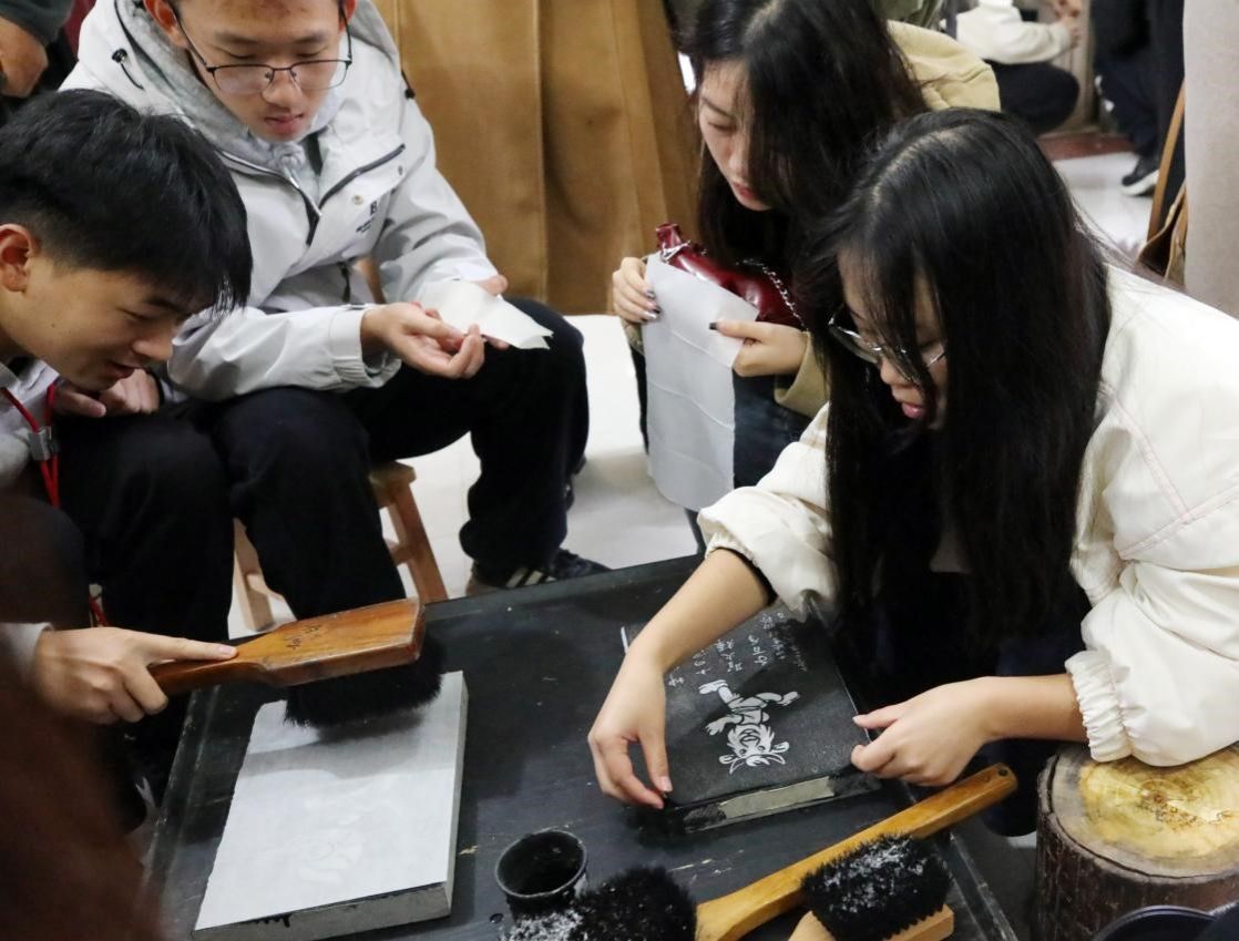 在实践环节,师生们普遍展现了浓厚的兴趣,现场气氛积极热烈,师生们在专业的工匠指导下学习了拓片的基本技法,包括选材、敷墨、拓制等关键步骤。他们小心翼翼地用宣纸覆盖在石刻表面,用拓包轻轻敲打,使墨汁均匀地渗透到纸张中,将石刻上的文字和图案清晰地拓印出来。在一次次的尝试、调整后,师生们都成功制作出了自己满意的拓片作品。
