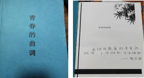李老师11级光电学院学子贺月圆,在大四毕业前夕专门查课表找到正上课的李老师,说李老师当初在高等数学课堂上,语重心长的教导他们,使他没有轻易放弃自己的文学梦,现在他就要顺利毕业了,而且实现了自己高中以来就有的一个梦想,写了人生的第一本小说—《青春的曲调》,300多页,他要把这作为毕业礼物送给李老师。