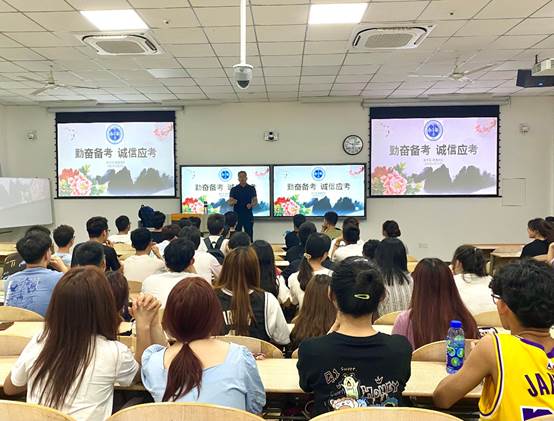 活动中,辅导员张鹏带大家回顾了近年学校因考试作弊被严肃处分的学生情况,号召大家引以为戒,别以身犯险。同时,他强调用努力、汗水赢得尊重更为持久,须合理、科学安排复习时间,并现场分享了部分优秀学长学姐的成长故事,最后以“坚持耕耘”为结语,对所有同学提出了要求。