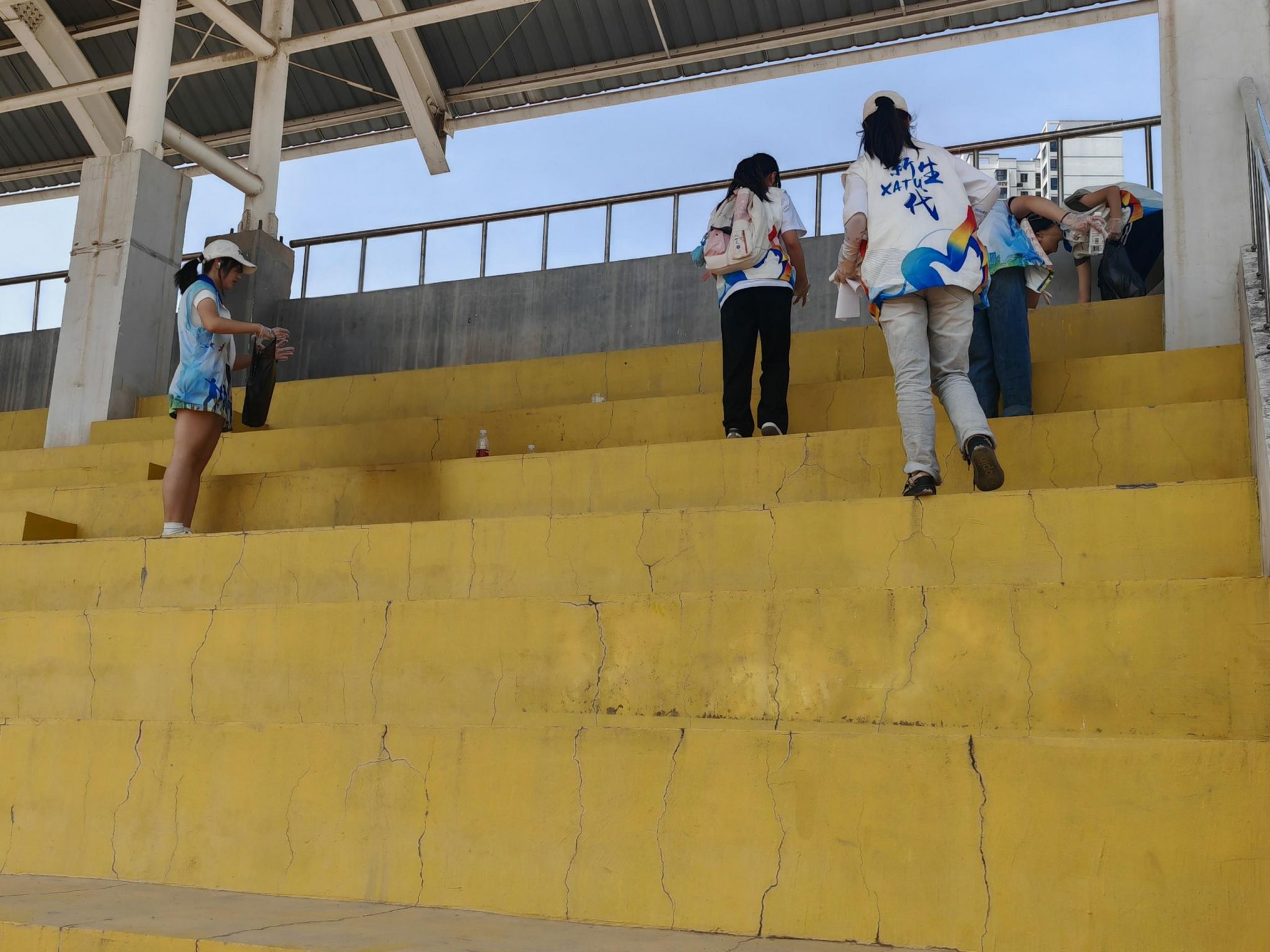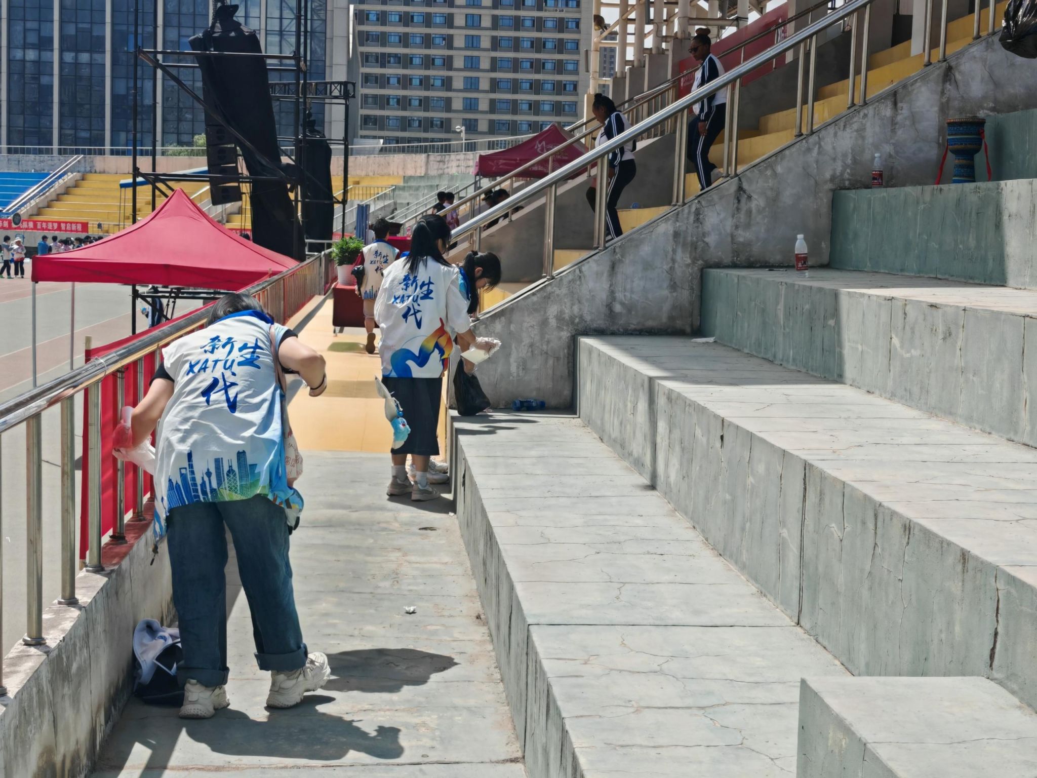 活动期间,志愿者们分工协作,清理散落的纸屑、加油棒、饮料瓶等垃圾,并对卫生死角进行重点整治。尽管天气炎热,志愿者们始终热情高涨,高效完成了全部座位的清扫工作,现场环境焕然一新。