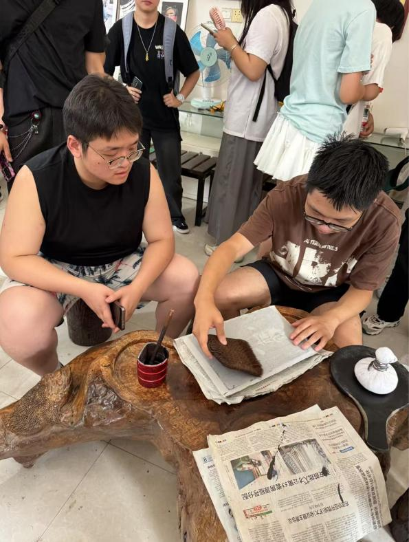 在实践环节,同学们分成小组,迫不及待地开始尝试。起初,大家动作生疏,有的同学喷水过多导致宣纸破损,有的同学拓包用力不均使得墨色深浅不一。面对这些问题,武老师和公共艺术中心的指导老师们耐心地一一指导,手把手纠正同学们的手法。随着不断练习,大家逐渐掌握了技巧,动作也越来越娴熟。
