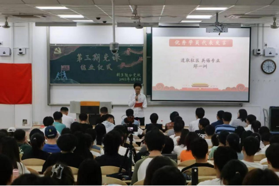 仪式在国歌中开始,通过视频短片回顾了本期党课的理论授课和实践活动。出席领导和老师为获奖学生颁奖,翟超老师为党课学员代表颁发“亮身份,做表率,我先行”入党积极分子标识贴,刘改琳老师为优秀学员代表颁发证书。