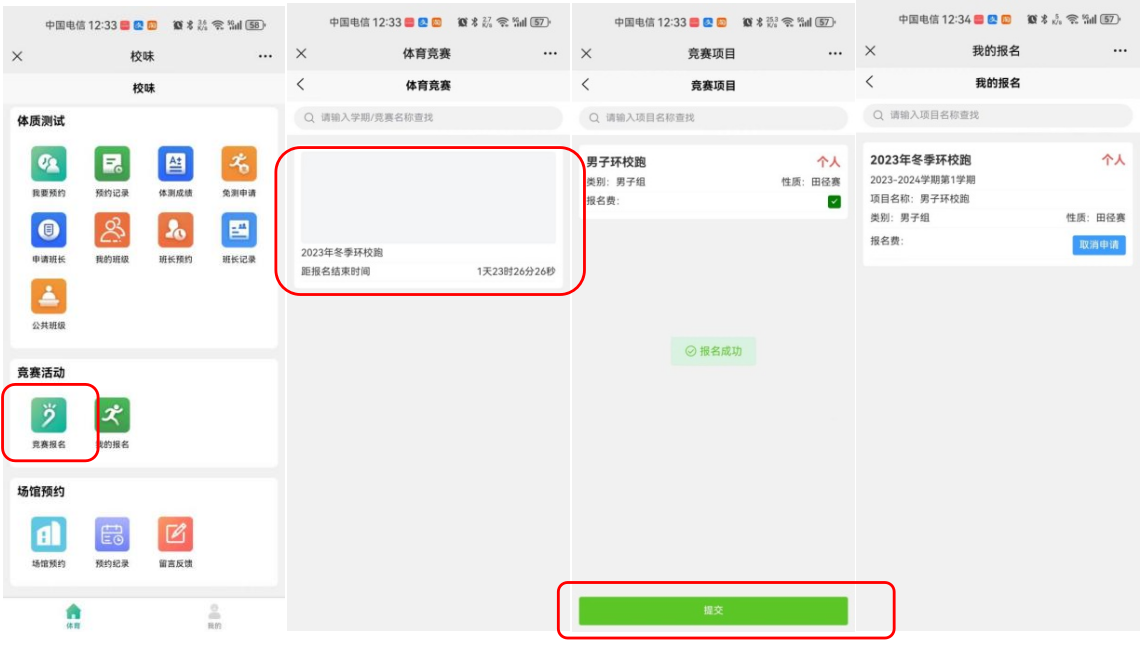 中“竞赛活动”--“竞赛报名”。选中项目下的复选框,点击“提交”,提示“报名成功”。