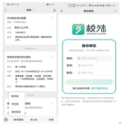 1、关注“校味”微信公众号,在“教学管理”中,点击身份绑定。然后选择学校,输入学号和姓名,进行微信和学校的绑定,后期登录微信公众号学生端时,要进行身份绑定的验证。