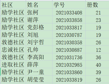 经过评比,最终推荐敦德社区刘宇哲、王瑞科,励学社区党彭格、胡莹莹,忠诚社区黄曼青、周静雅,进取社区张骞、薛萍共8名同学参与校级“阅读之星”评选。